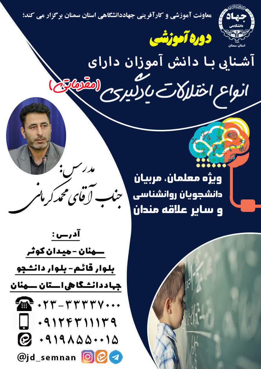 دوره آموزش مقدماتی آشنایی با دانش آموزان دارای اختلالات یادگیری، ارزیابی، تشخیص و مداخله، در مرکز آموزش کوتاه مدت جهاددانشگاهی استان سمنان برگزار می شود.